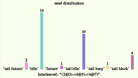 When a message is sent, it might involve a block, a future, a busy object or an idle one (which combined with tail elimination makes for a total of eight possibilities). Messages to blocks (or with blocks as arguments) or to future objects suspend the sender until the result is ready. Messages to busy objects (those already executing some message) allow the sender to continue, but the message is queue so the ammount of parallelism doesn't increase. Messages to idle objects allow both the sender and the receiver to execute in parallel. The figure shows that this is the most common case, which is why tinySelf is "embarassingly parallel".