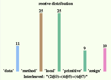 Another way to view messages is to look at what the receiver does with them. There were 80 messages in this example (34 sends plus 46 selfSends) and tinySelf stats showReceives shows how they were distributed. The 25 messages marked as 'local' were selfSends that matched slots in the block or method that sent them - this includes constants, data access and assignment. The other sends were actually looked up in some object. 11 were access to data slots or constants, 25 invoked a method, 9 executed a primitive operation while 10 executed the assignment primitive changing the value of some data slot.